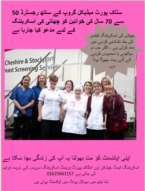 We have been informed by Macclesfield District General Hospital that invitations for NHS breast screening will commence for eligible patients registered with SMG. Invitations will start to be sent between 21st March and 19th April 2024.